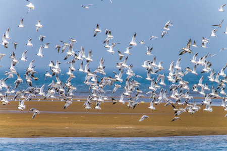 Flock of birds flying in Beidaihe wetland, Qinhuangdao, Hebei Province, China