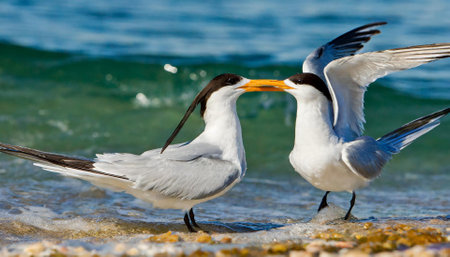 Two tern birds fighting for food on a beach in Florida.