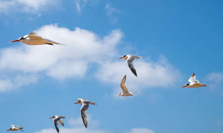 Panorama low angle view group of seagulls soaring flying under sunny cloud blue sky looking to be feed at shoreline of South Padre Island, Texas Gulf Coast, gulls are seabirds of Laridae family. USA