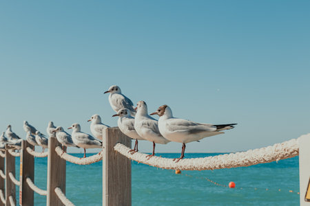 Seagulls perched along a rope barrier by the sea on a sunny day