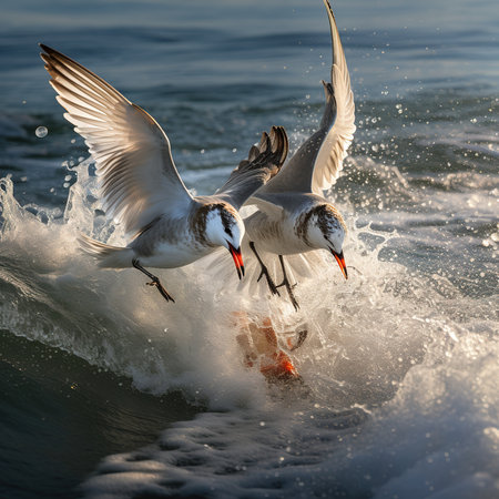 gulls hovering above the ocean surface off the coast