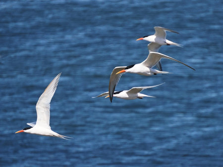 Common Terns flying over water searching for fish.