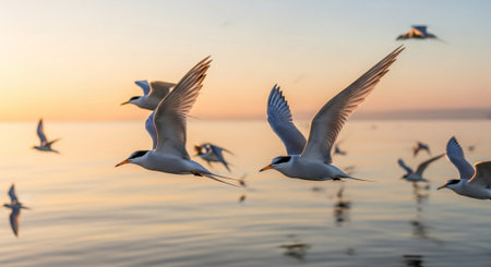 The group of sandwich terns in seabird parks and reserves of Senegal, Africa. They areflying in lagoon Somone. There is sunset. it is focused on the center of the birds.