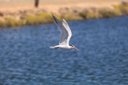 Soaring tern bird gliding along in flight over the ocean waters.