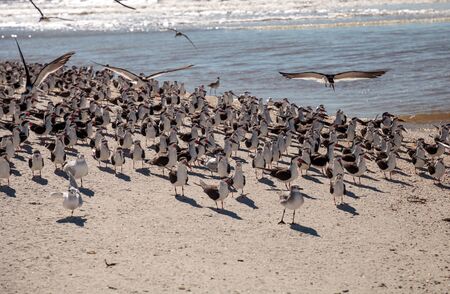 Nesting black skimmer terns Rynchops niger on the white sands of Clam Pass in Naples, Florida.
