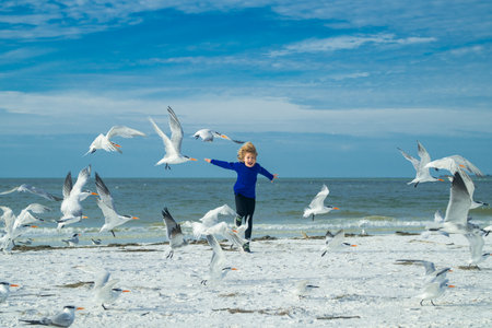 Carefree kid running, chasing birds. Child chasing birds near summer beach. Excited boy running on the beach with flying seagulls birds.
