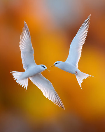 Silhouettes of flying common terns. Flying common tern on the sunset sky background. Scientific name: Sterna hirundo.