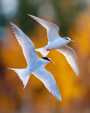 A couple of white birds flying through the air with their wings spread.