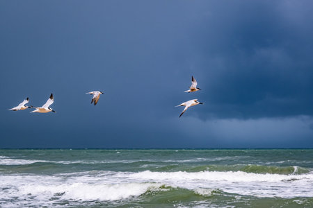A beautiful shot of seagulls flying over the stormy sea on background of the cloudy sky