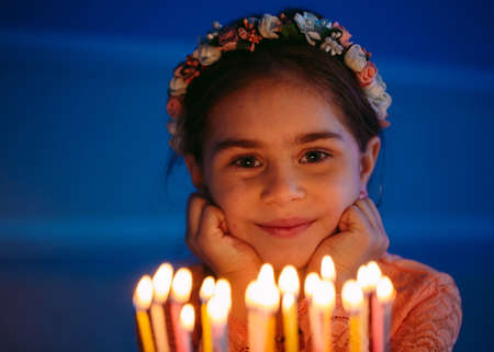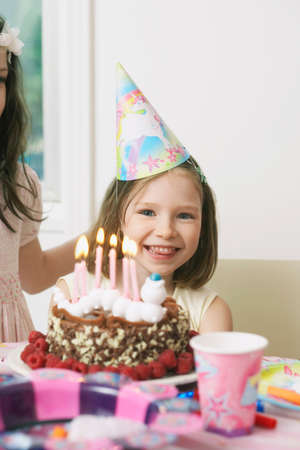 Portrait of happy smiling little girl standing holding cake with candles, celebrating birthday, being ready to make wish and blowing, posing indoor with festive inscription and balloons on background