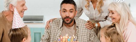 cropped view of woman touching shoulders of man blowing out candles on birthday cake, panoramic shot