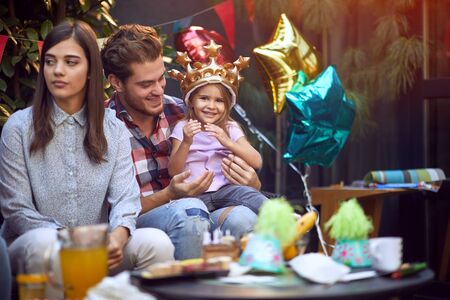 Multi generation family celebrating birthday of little girl and having garden party outside on patio.