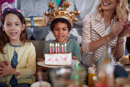 Happy little boy holding a birthday cake and celebrating with friends and family in a festive atmosphere at home. Family, celebration, together