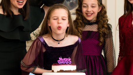 Joyful family gathering filled with laughter as children celebrate a birthday with a beautifully decorated cake, balloons, and warm lights, creating a cozy atmosphere at home.