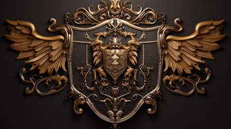 3D digital illustration of medieval coat of arms with gilded cross blades and golden shield