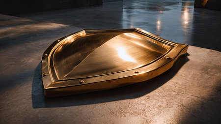 Stunning golden shield rests on a smooth floor, showcasing exquisite craftsmanship and dramatic lighting, perfect for historical or fantasy themes.