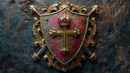 The medieval coat of arms with red shield and gold gilded crossed blades is illustrated in 3D digitally