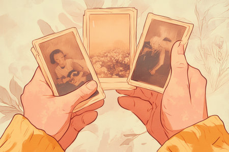 Hands grasp old photographs, revealing cherished memories in a cozy setting; a nostalgic atmosphere surrounds the warm hues of the images.