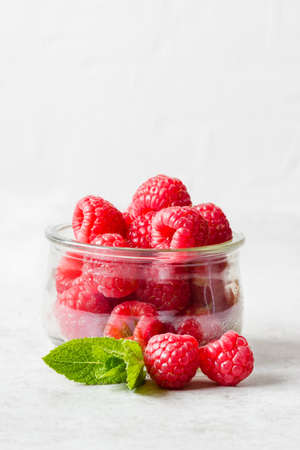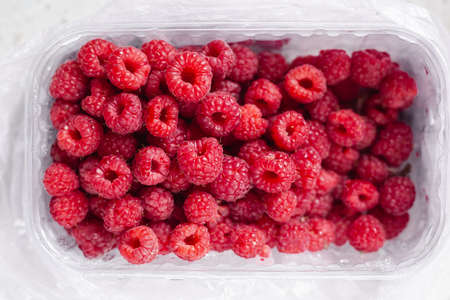 Fresh juicy Raspberries on the table. close up raspberry in the container. autumn harvest. healthy food. Pink ripe berries, sweet natural diet snack