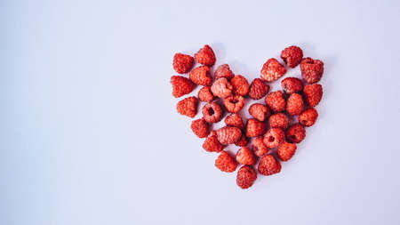 A beautiful red heart sculpted with a multitude of raspberries laying against a pure white background. Summertime berries. Copy space