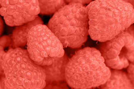 Living Coral background with fresh organic raspberries, copy space. Color of the year 2019. Nature berry background. Macro photo. Top view, flat lay