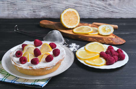 Lemon cake with raspberries, a cutting board with slices of lemon, sieve with icing sugar on a table of black color
