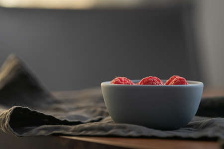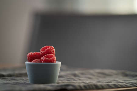 ripe raspberry in a small blue bowl on a linen background with copy space