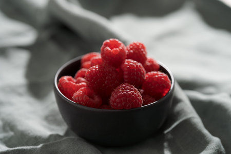 Raspberries in black bowl on linen napkin closeup