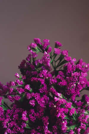 Beautiful pink flowers of Statice latifolia on a dark background. Close-up. Selective focus.