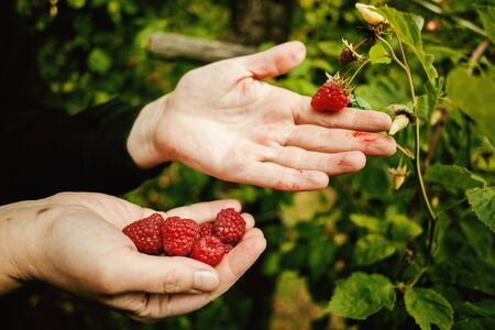 collected fresh juicy beautiful raspberry in hands, summer landscape, rustic mood