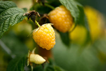 Closeup of golden raspberry fruits growing in summer kitchen garden.