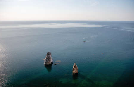 waterfront port Mandraki Rhodes island, clear turquoise water, rocks and bottom in clear water, top view, bird's eye view