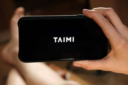 Taimi dating service using on the smartphone by LGBT lesbian girl for fall in love and communication. An illustrative editorial image. San Francisco, US, June 2020.