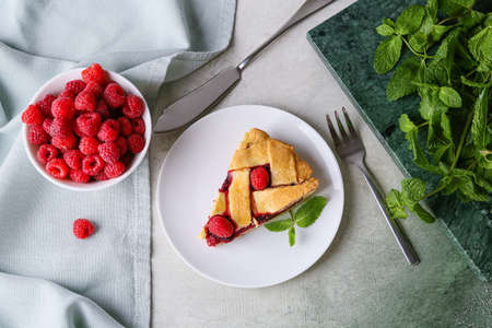 Piece of delicious raspberry pie on table