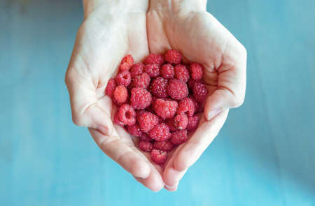 Handful of fresh raspberries in mother hands on blue rustic wood background. Harvest, healthy food and health care concept. Natural ripe organic berries on wooden table, top view.