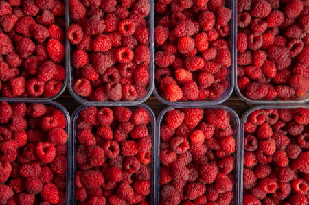 Ripe raspberries collected in boxes