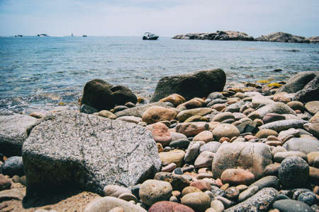 Close-up of some pebbles on the seashore taken at ground level on a sunny day