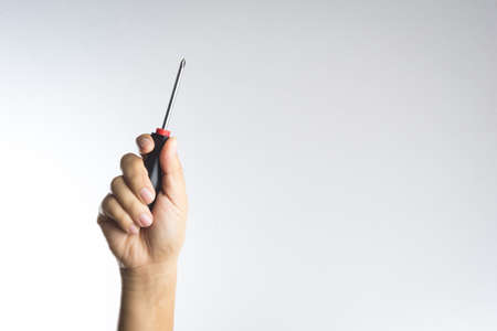 Hand holding screwdriver on white background