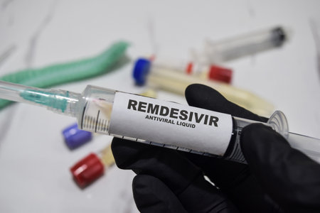 Remdesivir antiviral liquid drug syringe in black gloved hands. Medical concept