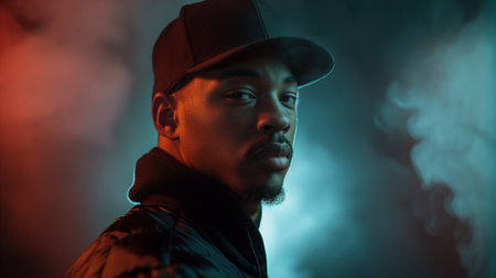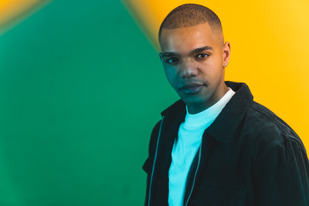 Black man fashion portrait on abstract colorful background. Afro american male model looking at camera, neon colored lighting. Created with Generative AI