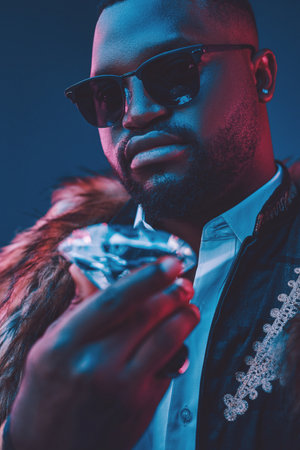 Rich african man with fur holding luxurious diamond