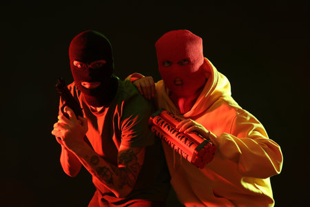 Young man and woman in balaclavas with gun and bomb on black background