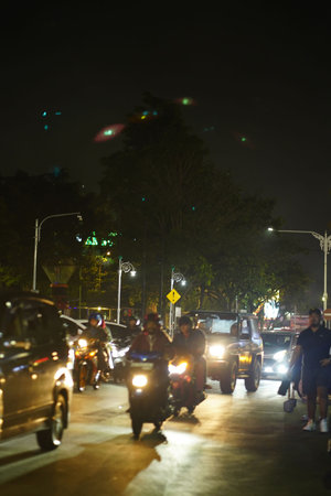 December 9, 2023. Batu City, East Java, Indonesia. The night life on the street of the city with busy traffic on Saturday night. Night Street Photography.