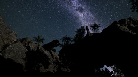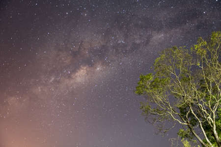 Long exposure and High ISO shot of star and milky way over the mountain and silhouette of tree at night.