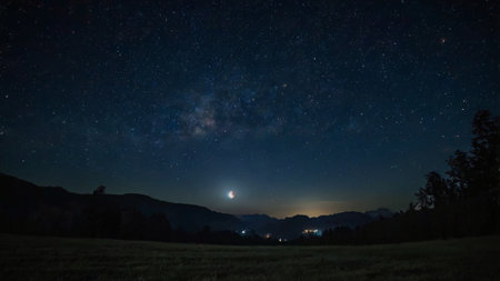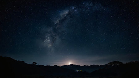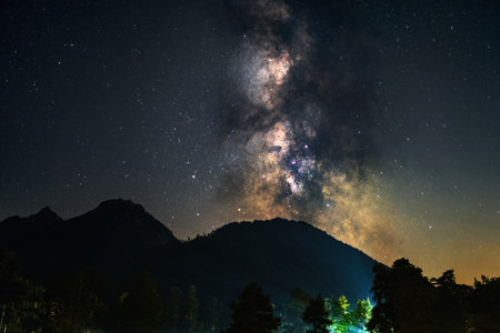 Milky Way galaxy in Universe astrophotography. Silhouettes of mountains and trees. Stars and nebula at night sky landscape