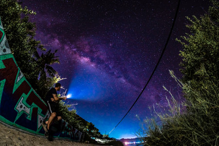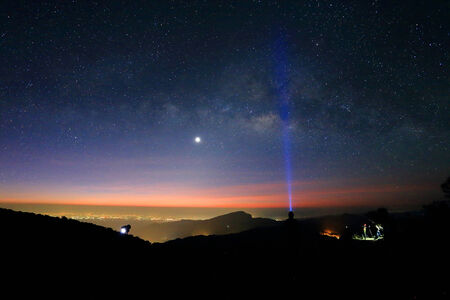 Person lighting up the starry night sky with a head torch while stargazing in the mountains. . High quality photo