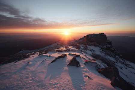 snowy mountain top with a view of the sunrise, showcasing the start of a new day, created with generative ai