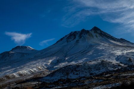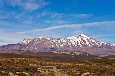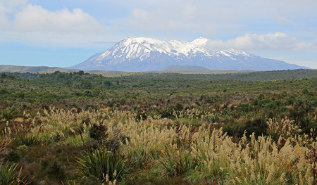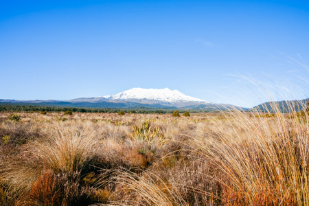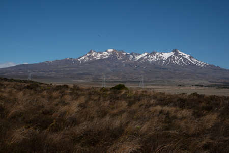Beautiful snow capped volcano Ruapehu in New Zealand desert Road