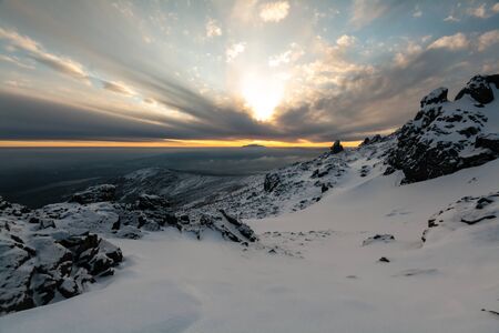 Stunning scene landscape during a cloudy day with sun ray through the cloud over the snow mountain.