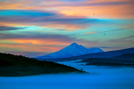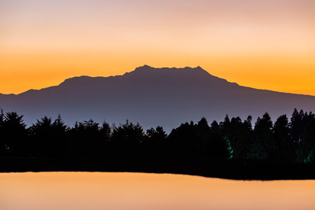 The mist-clad vegetation and mountain range during the beautiful sunrise